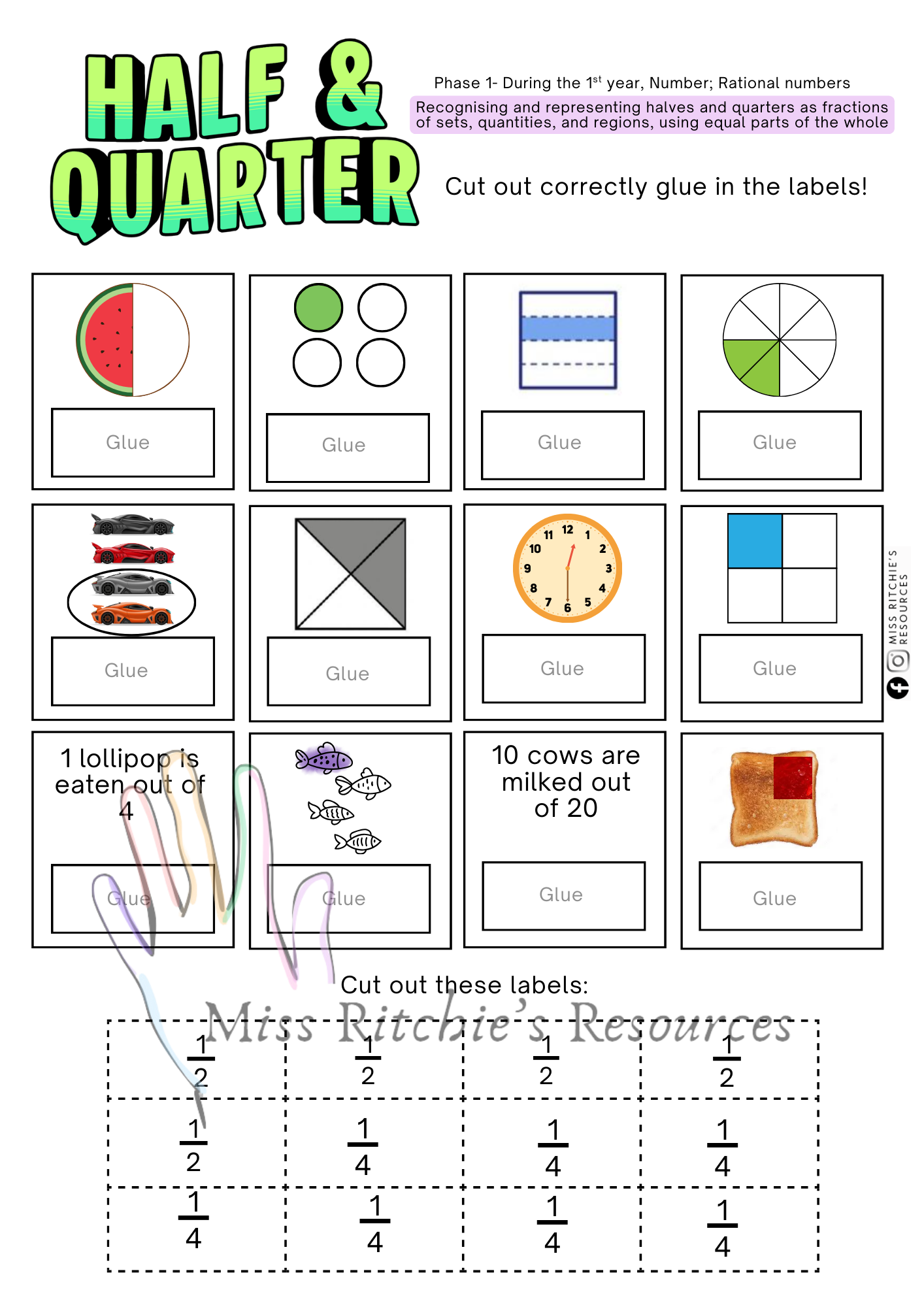 This cut and Paste activity supports students learning of what one half and one quarter is. This worksheet provides a well rounded understanding of what half and quarter is.