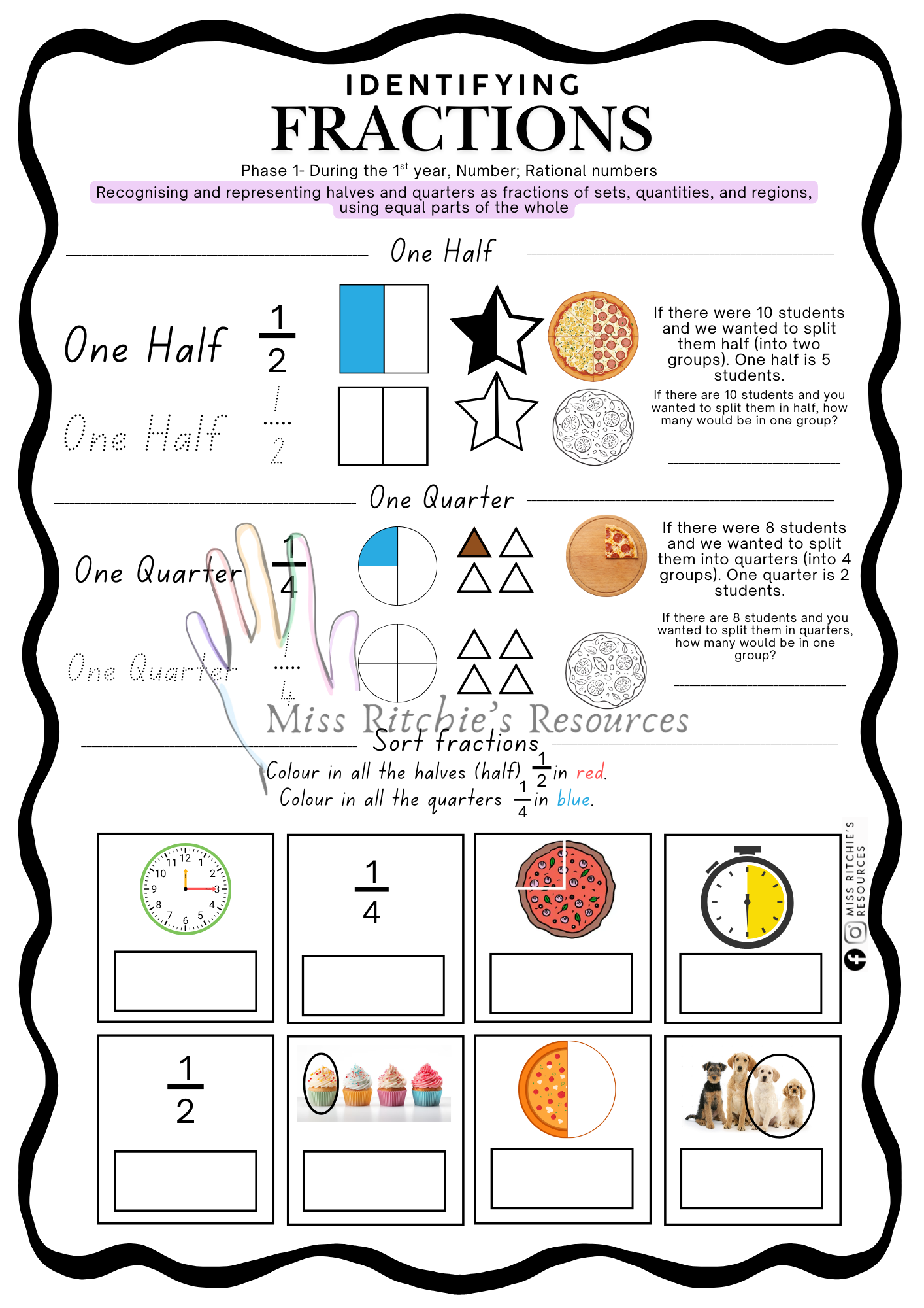 This well rounded and comprehensive worksheet will ensure your students have a clear understanding of what is one half and one quarter.